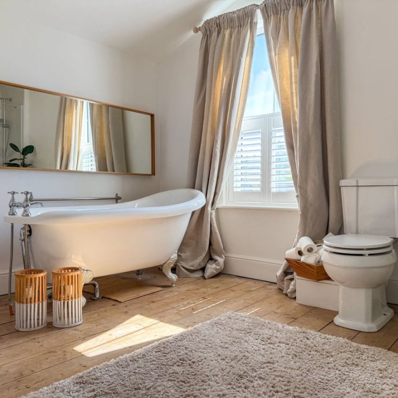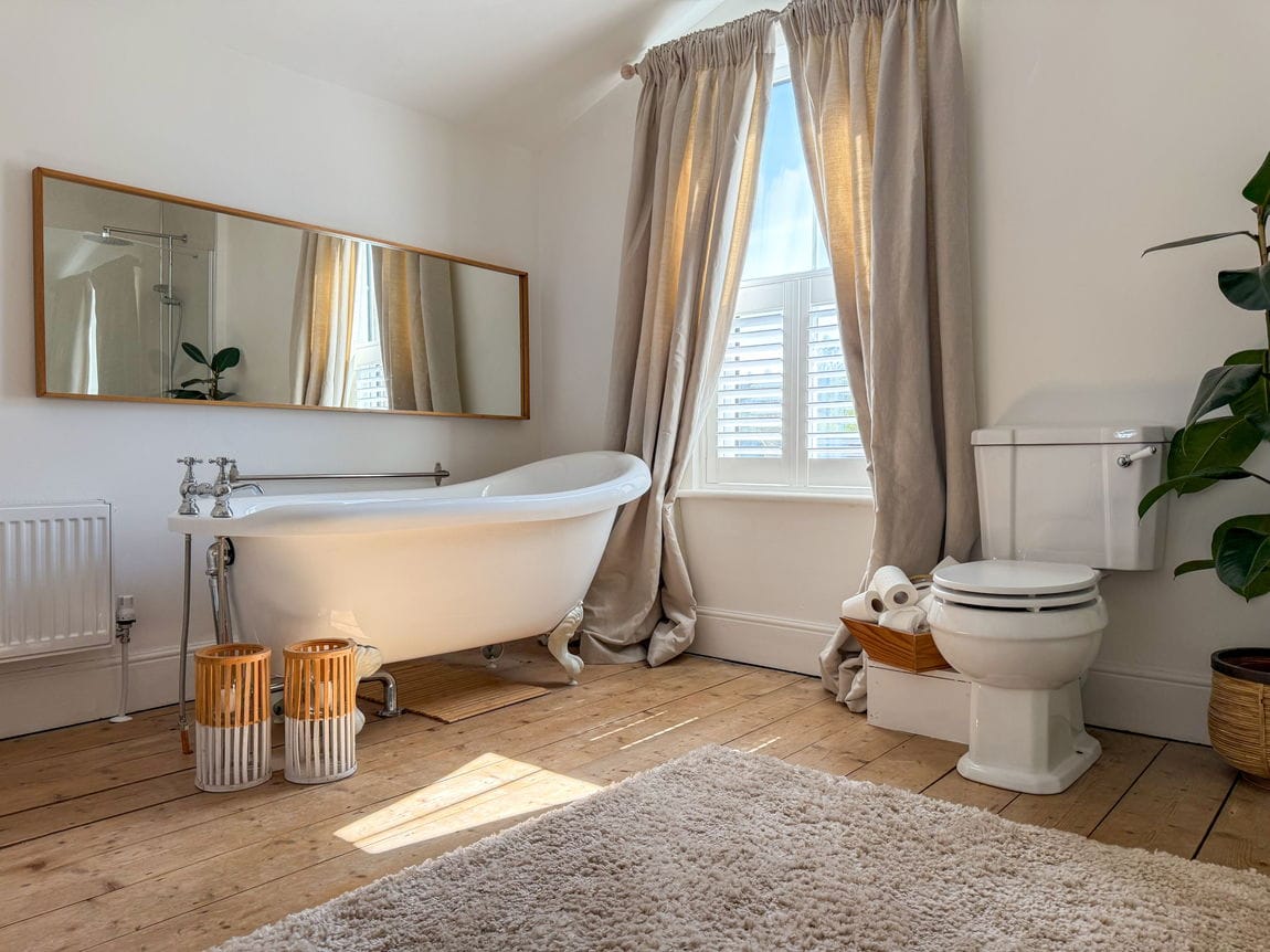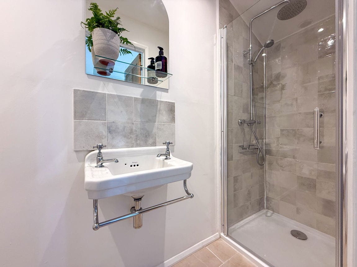 Inside, you’ll find a bright separate living room, a dedicated dining room perfect for entertaining, and a stylish galley kitchen. A sleek ground-floor shower room adds practicality, while upstairs boasts two generous double bedrooms and a luxury bathroom with a free-standing bath and walk-in shower.