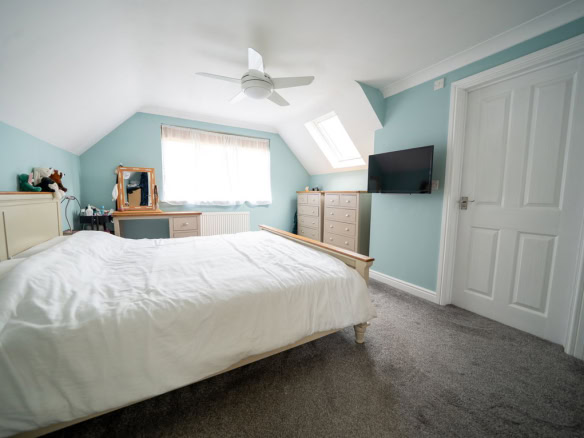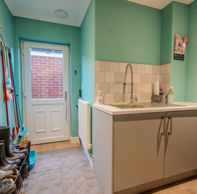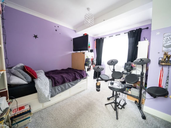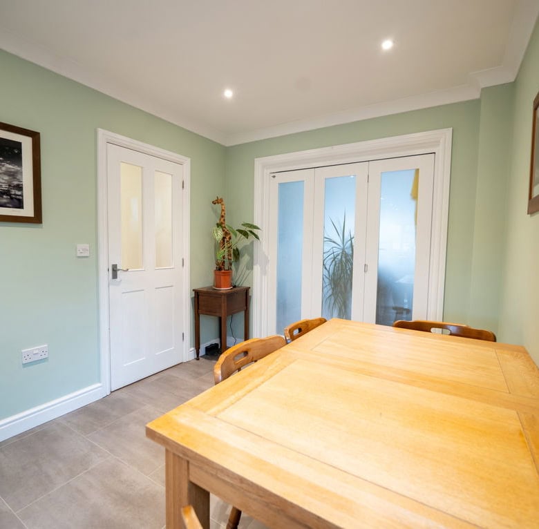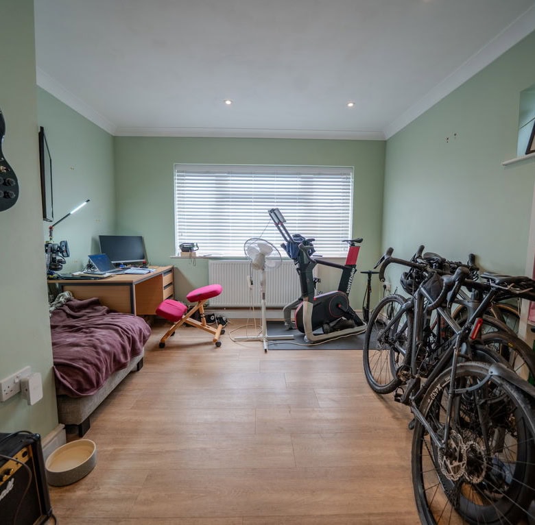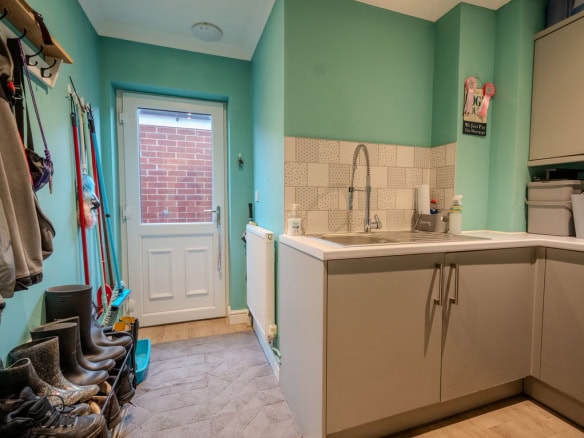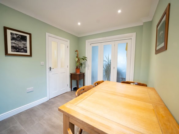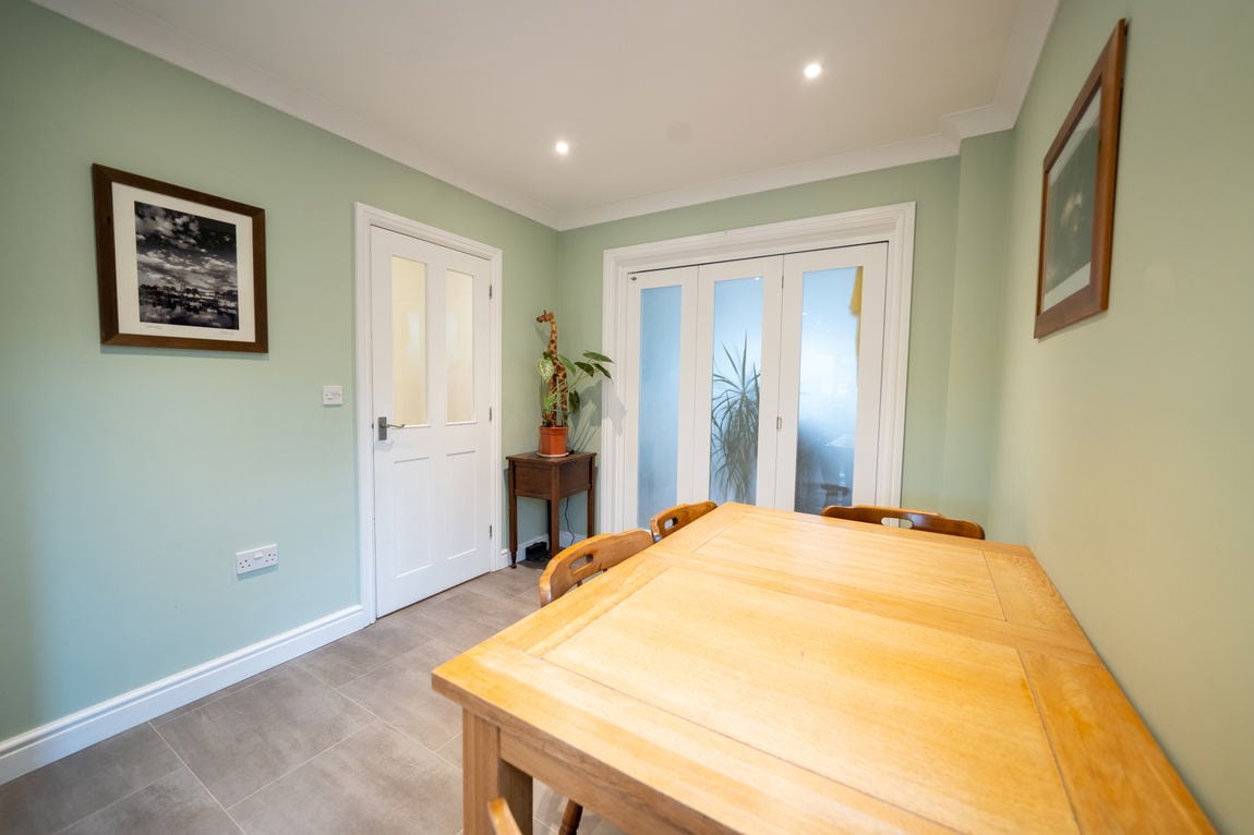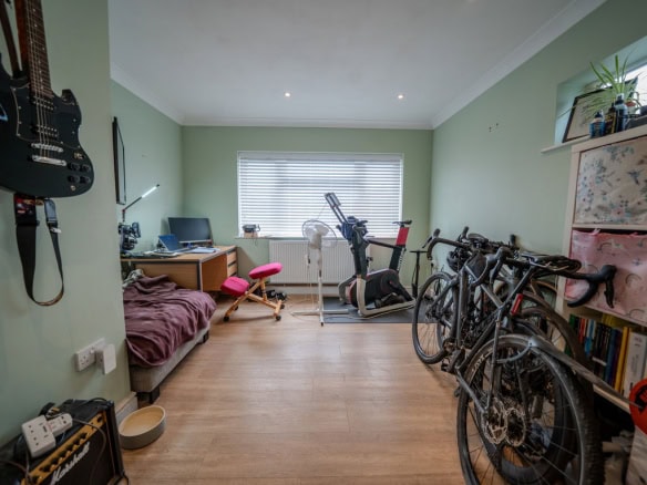 To the rear of the property is a large kitchen dining room which forms the heart of the home, offering ample space for family life and entertaining. Adjoining this is a substantial living room, also positioned at the rear, with French doors opening directly onto the garden, creating a seamless connection between indoor and outdoor living. To the front of the house is a further reception room which would work equally well as a sitting room, home office or playroom. The ground floor also benefits from a useful utility area, a downstairs WC and a ground floor bedroom, providing flexible accommodation for guests, multi generational living or working from home.