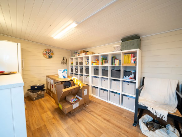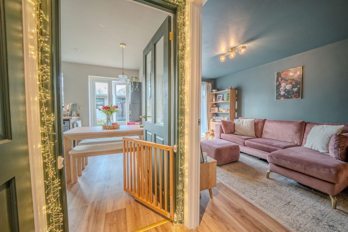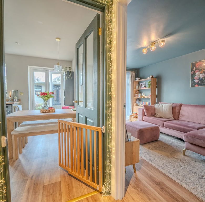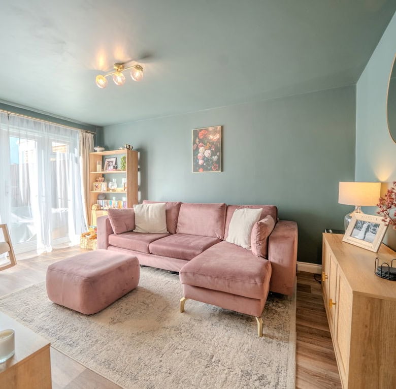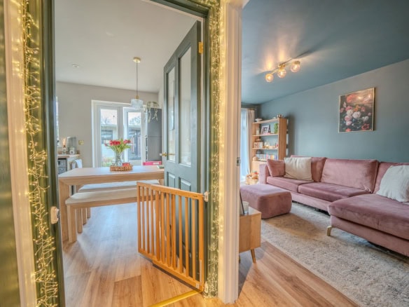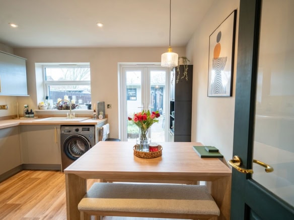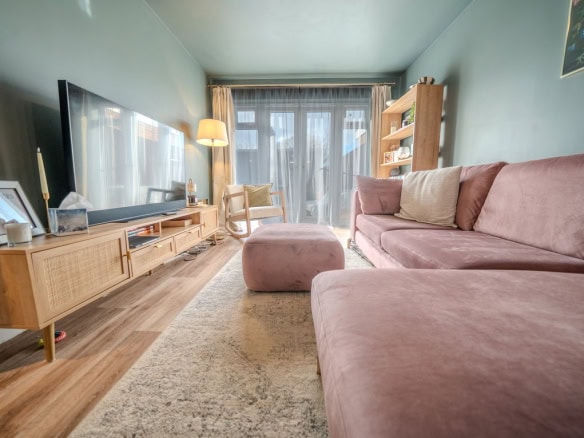 The heart of the home is the modern kitchen which comes complete with integrated appliances and a configuration that allows space for a dining table. This room is designed for everyday living as well as entertaining, with French doors opening directly to the south facing garden allowing natural light to flood the space. Adjacent is the generous living room which also enjoys French doors to the garden, creating a seamless connection to the outside.