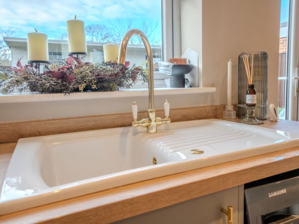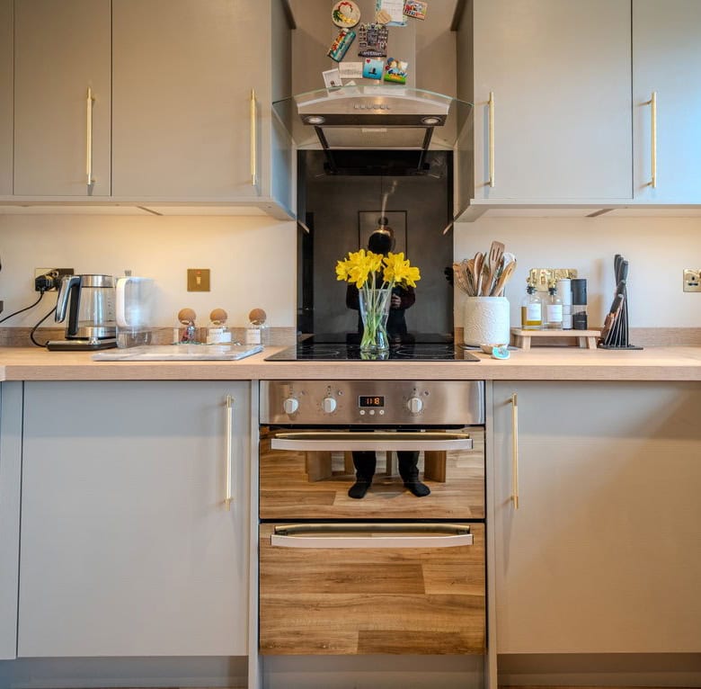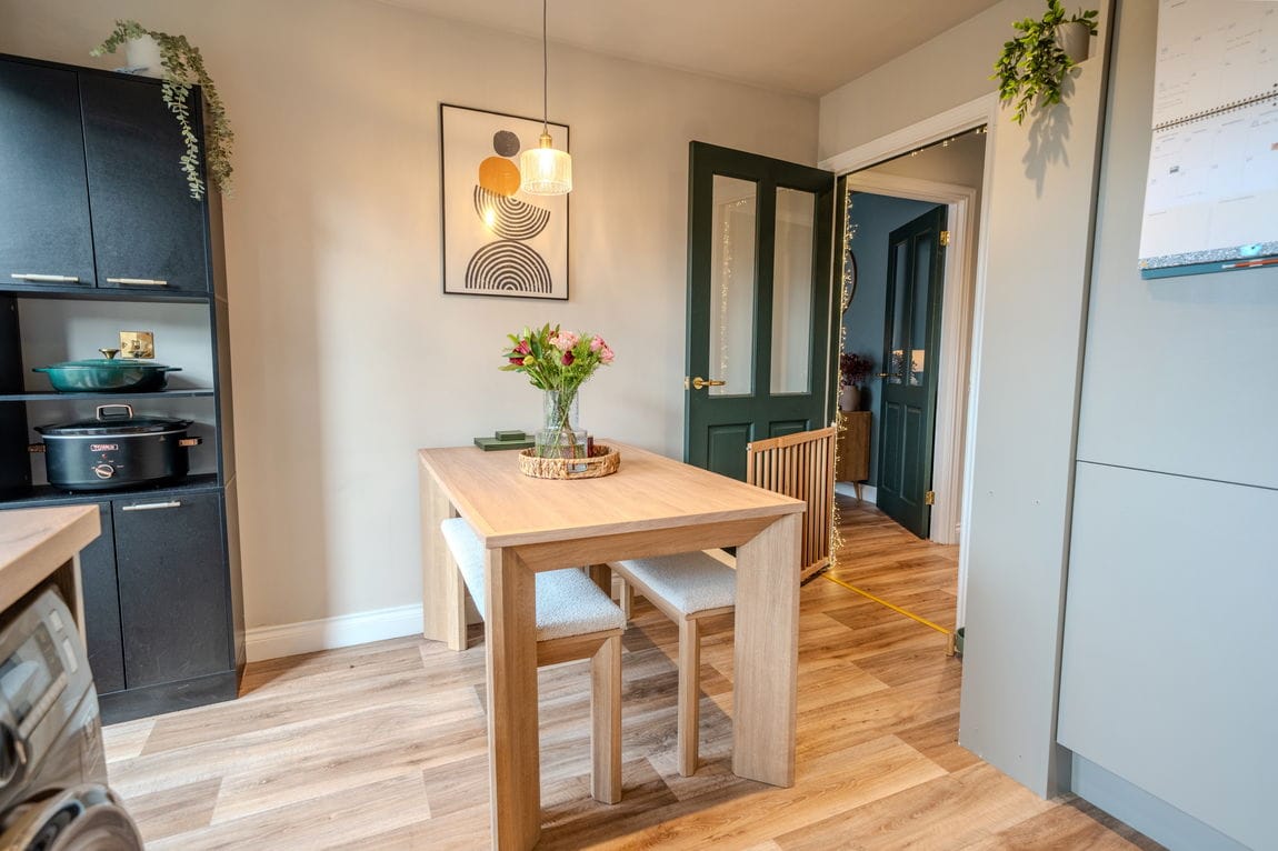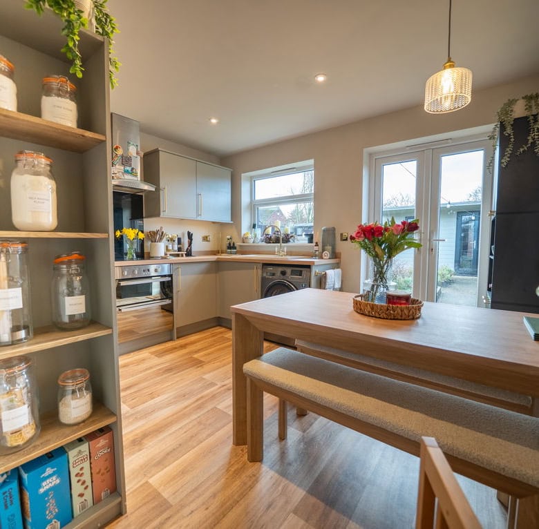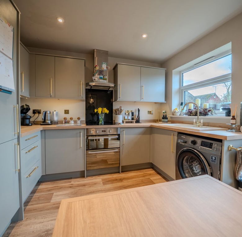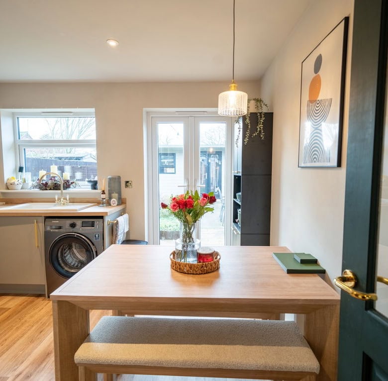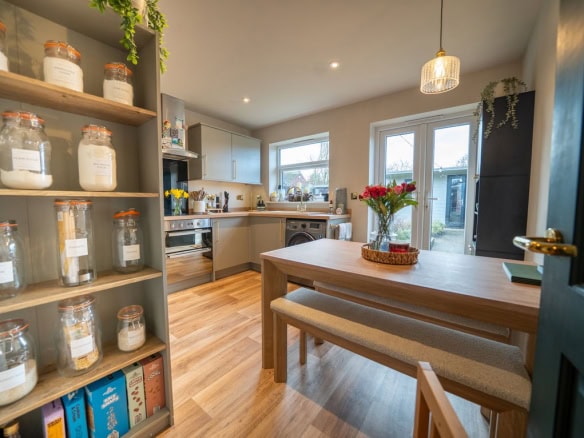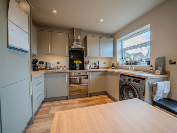 - Contemporary kitchen with integrated appliances and space for a dining table
