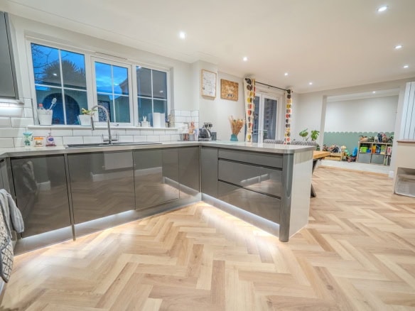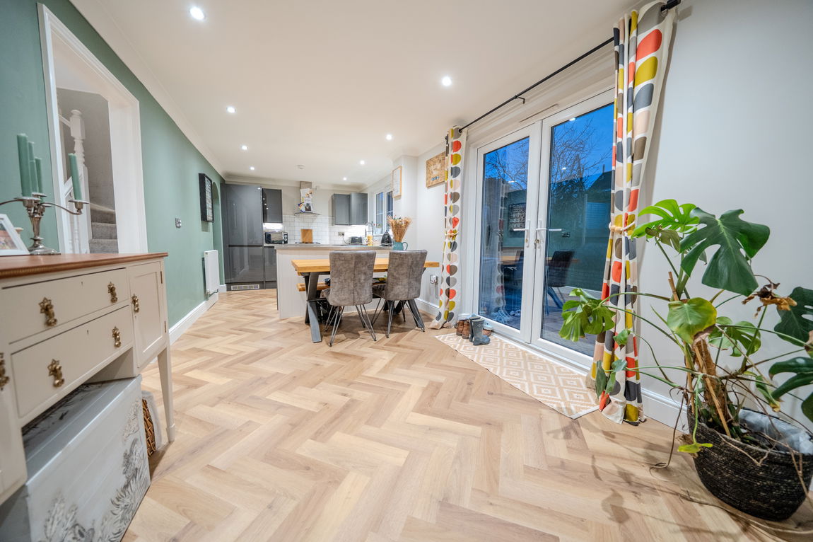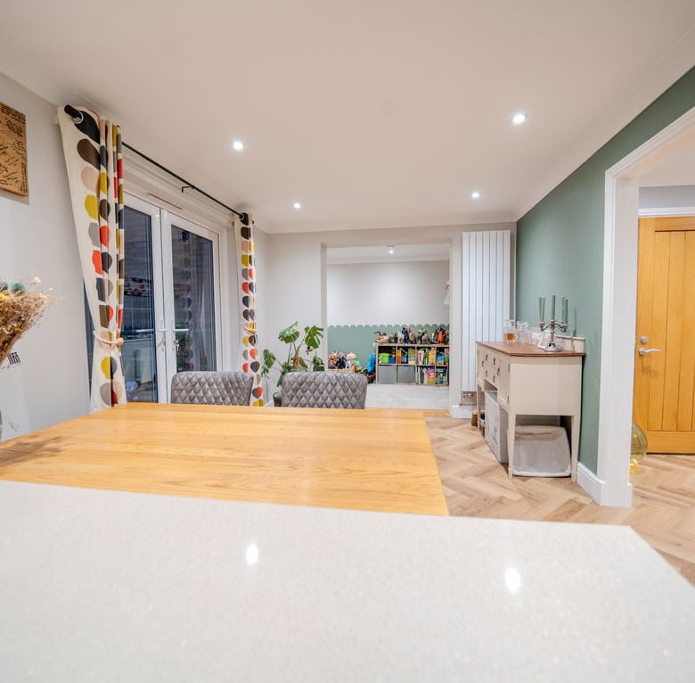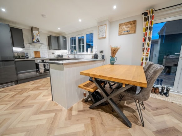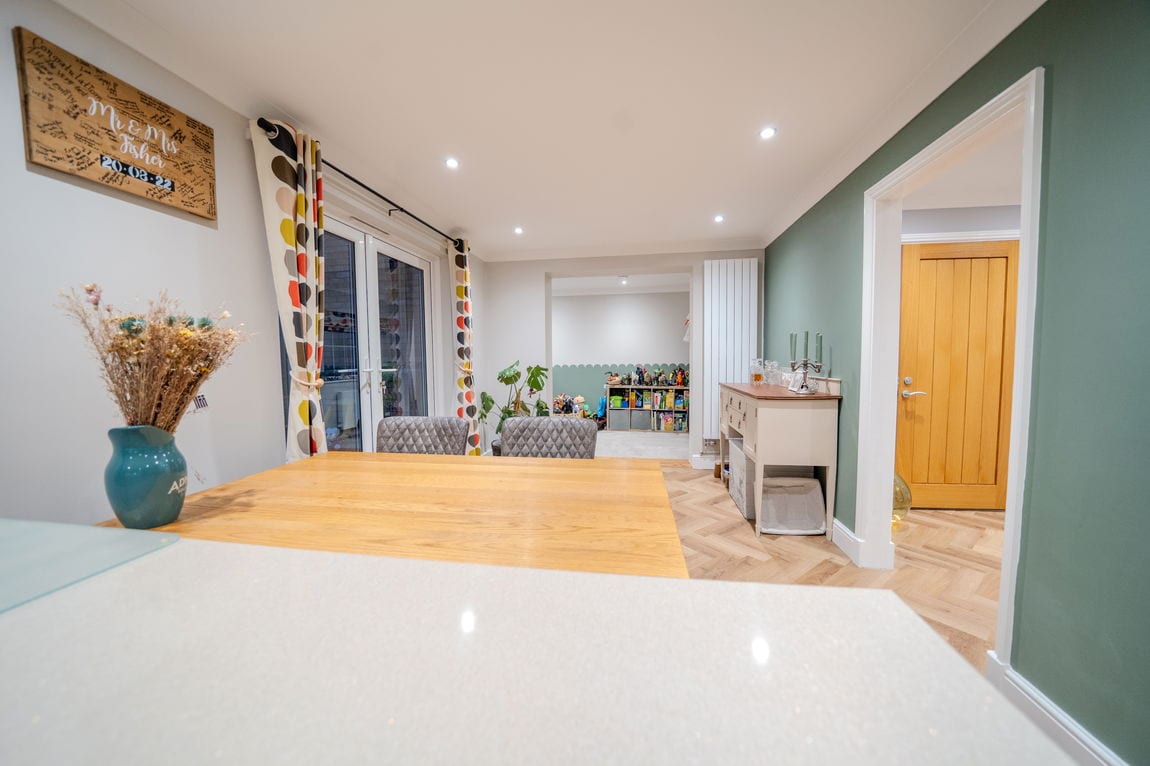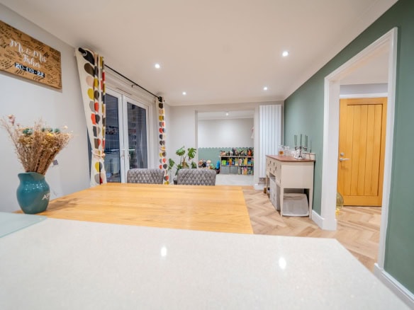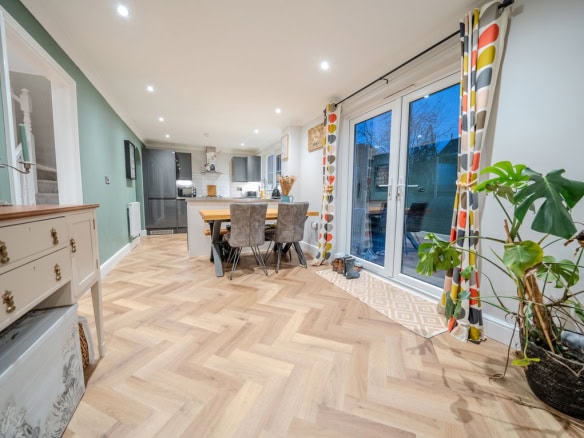 Stepping inside, you’re greeted by a spacious entrance hall leading to a large open-plan kitchen/dining area, perfect for entertaining and family life. The stylish kitchen is complemented by ample dining space with views and access to the beautifully landscaped rear garden. At the front of the home, there’s a separate living room ideal for relaxing with a wood burner, while the converted garage now serves as a versatile additional reception room, currently used as a playroom. A modern downstairs WC completes the ground floor.