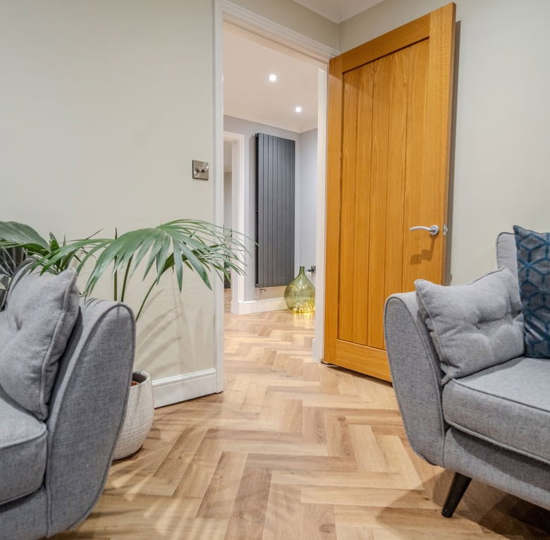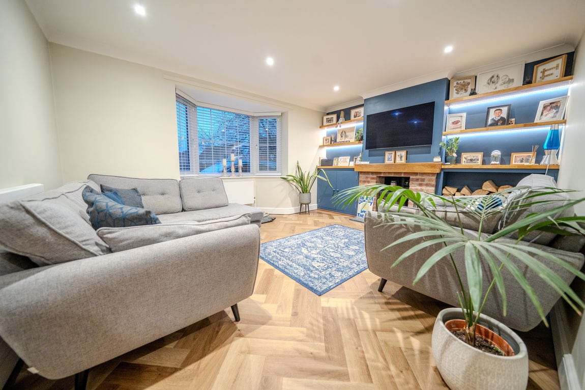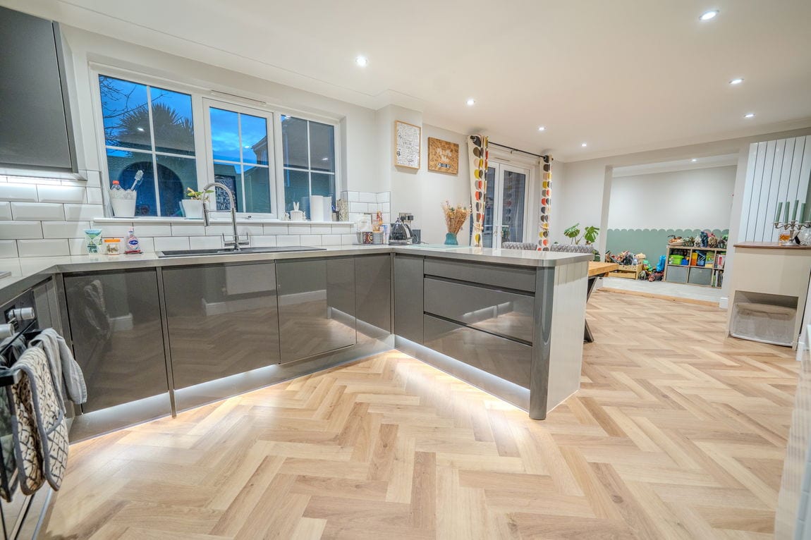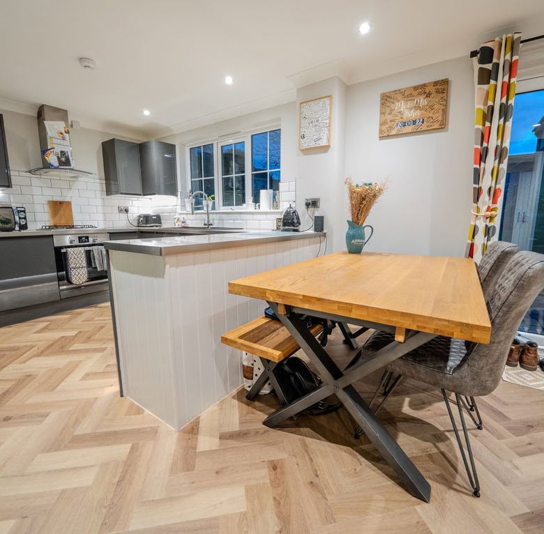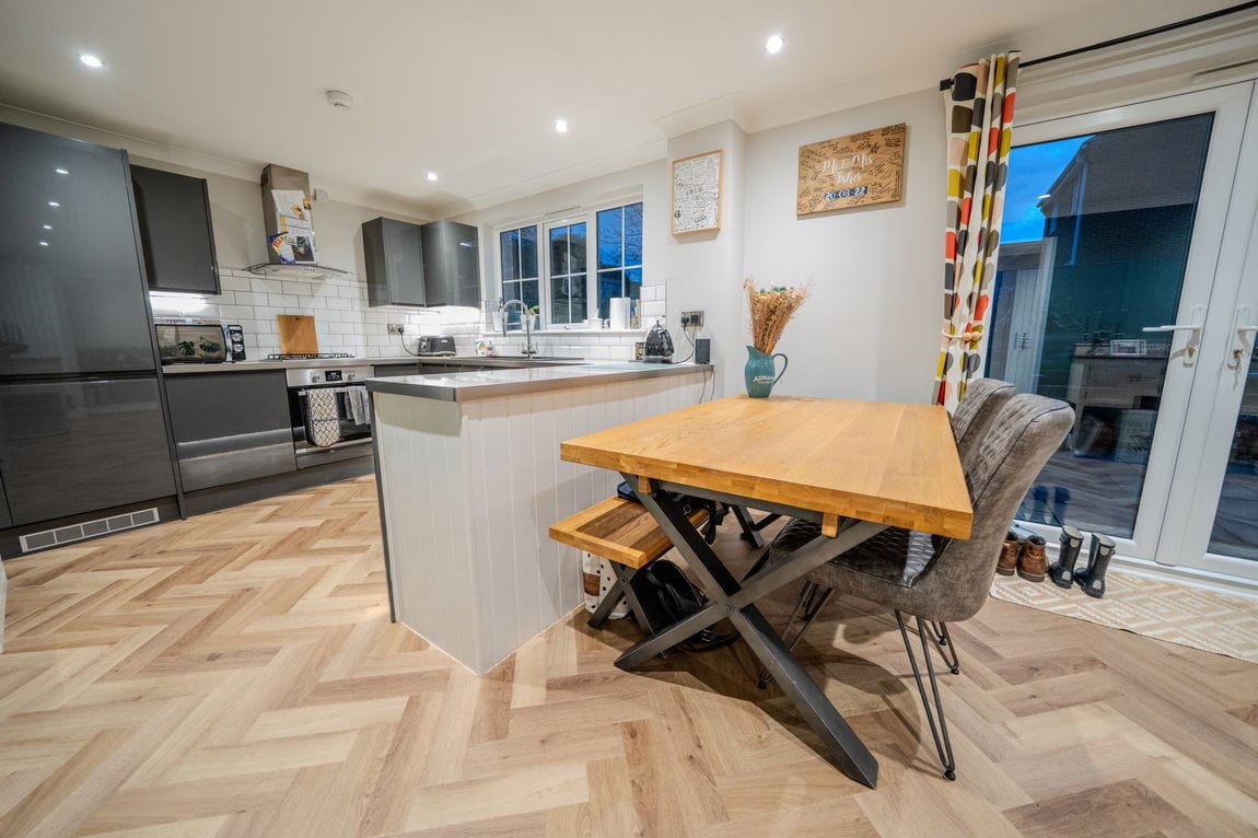Stepping inside, you’re greeted by a spacious entrance hall leading to a large open-plan kitchen/dining area, perfect for entertaining and family life. The stylish kitchen is complemented by ample dining space with views and access to the beautifully landscaped rear garden. At the front of the home, there’s a separate living room ideal for relaxing with a wood burner, while the converted garage now serves as a versatile additional reception room, currently used as a playroom. A modern downstairs WC completes the ground floor.
