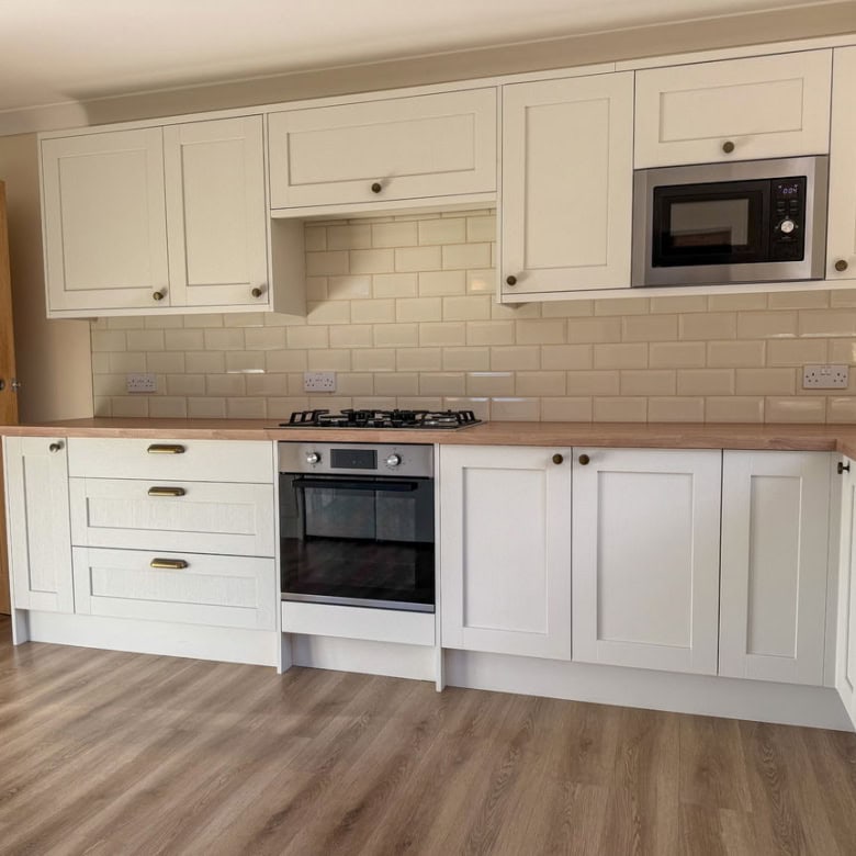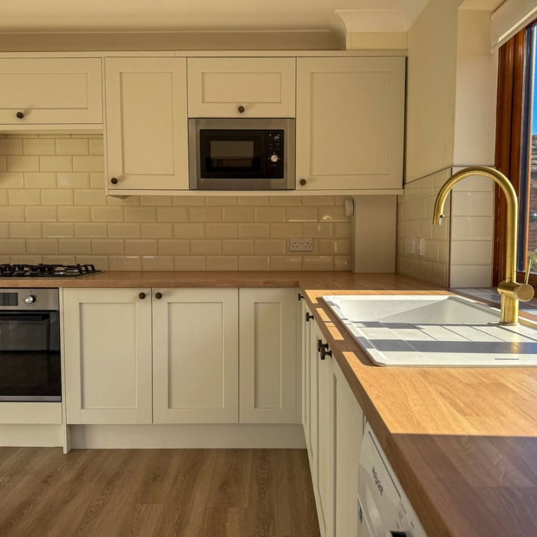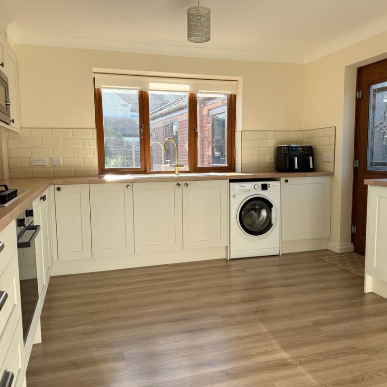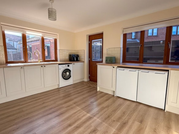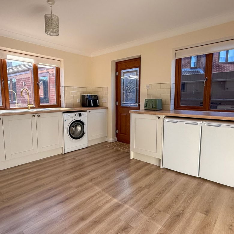 - Bright and airy kitchen with dual-aspect windows, ample cabinetry, and generous worktop space.
