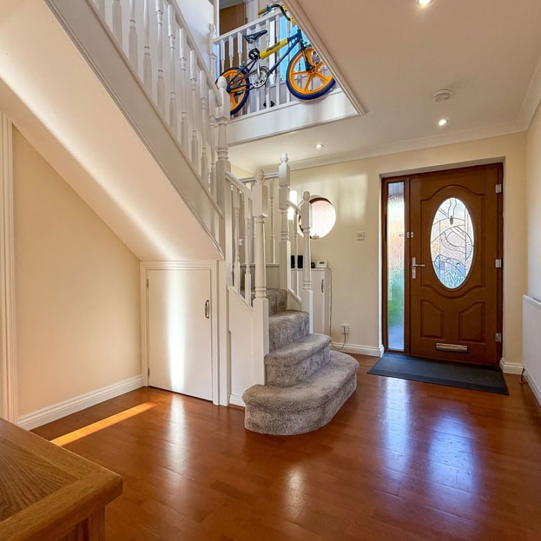 As you enter through the front door, you’re greeted by a grand entrance hall with a beautiful curved staircase and plenty of space for coats and shoes. From here, you have access to the large dining room at the front of the property, ideal for family meals or entertaining guests, along with a convenient downstairs WC.