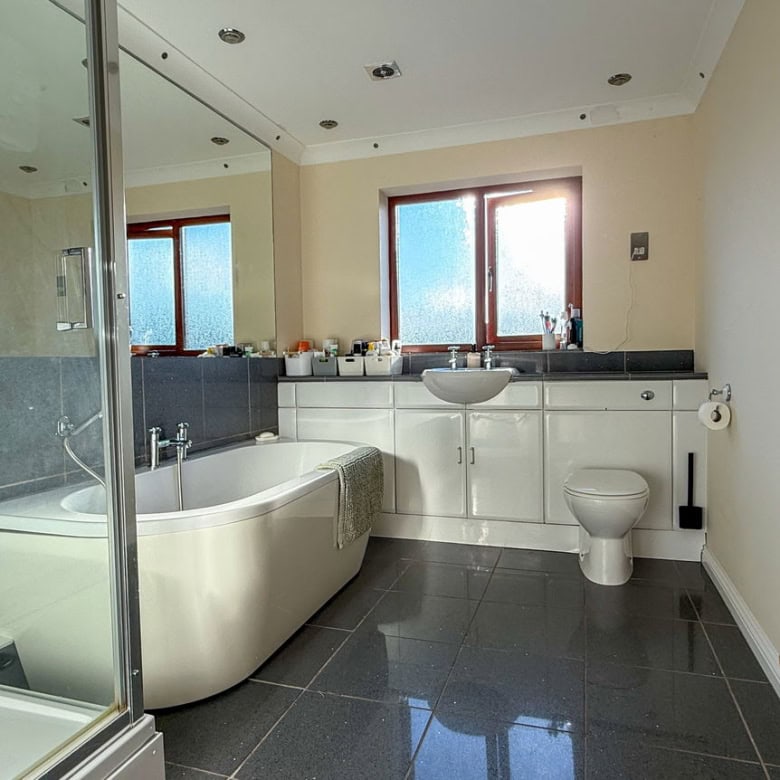 - Modern family bathroom featuring a freestanding bath and separate shower.
