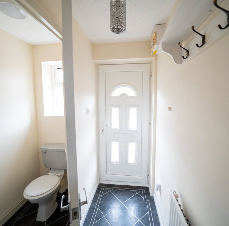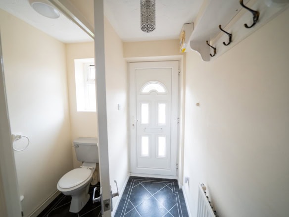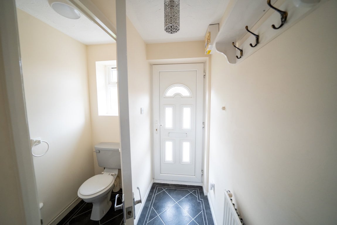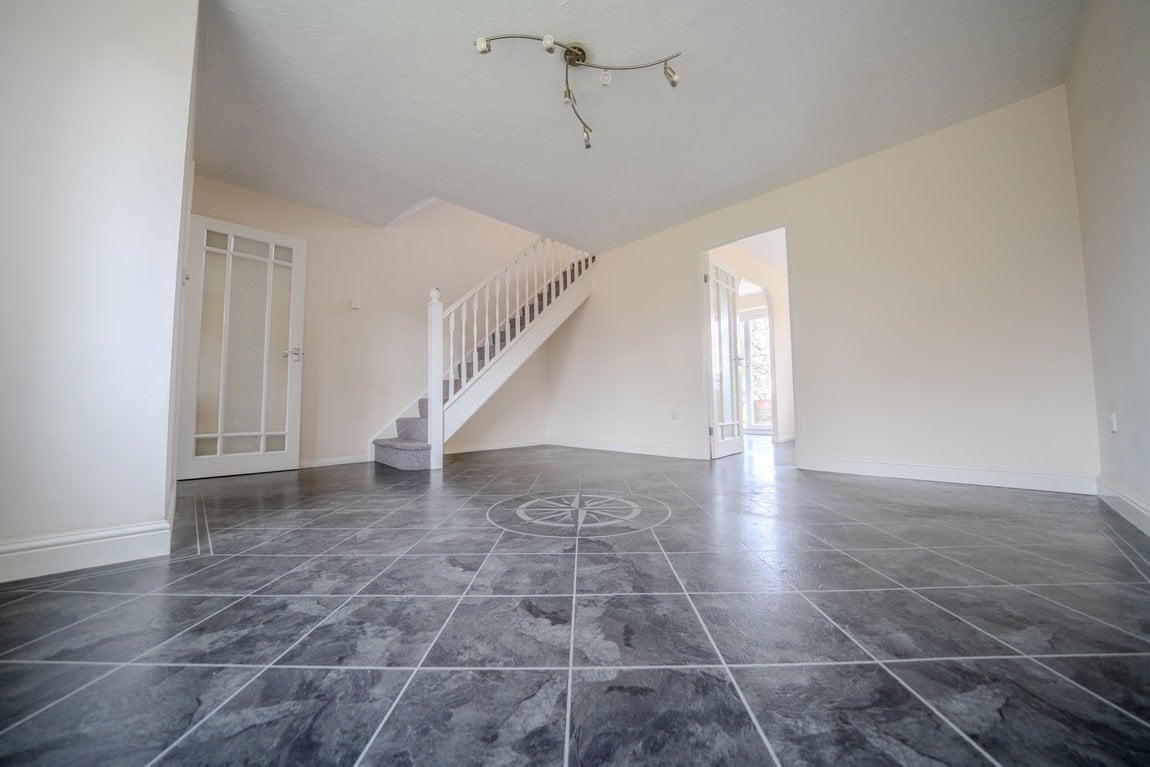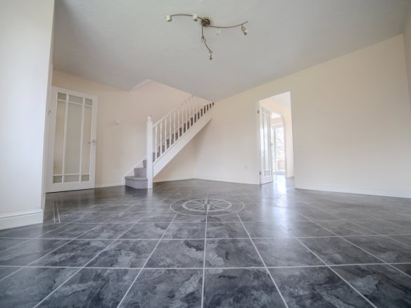 Stepping inside, you’re greeted by a spacious entrance hallway, with a convenient downstairs WC positioned to the right. The main living room sits just ahead, a bright and comfortable space with the staircase leading to the first floor.