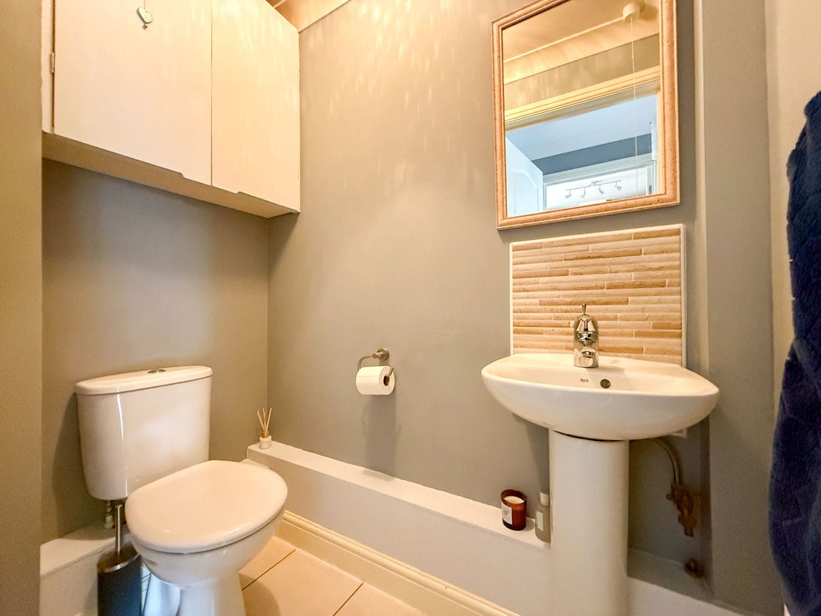 The property boasts a welcoming entrance hallway leading to a large living/dining room, complete with French doors opening onto a south-facing rear garden – perfect for relaxing or entertaining. The kitchen is well laid out and practical, while a convenient downstairs WC completes the ground floor.