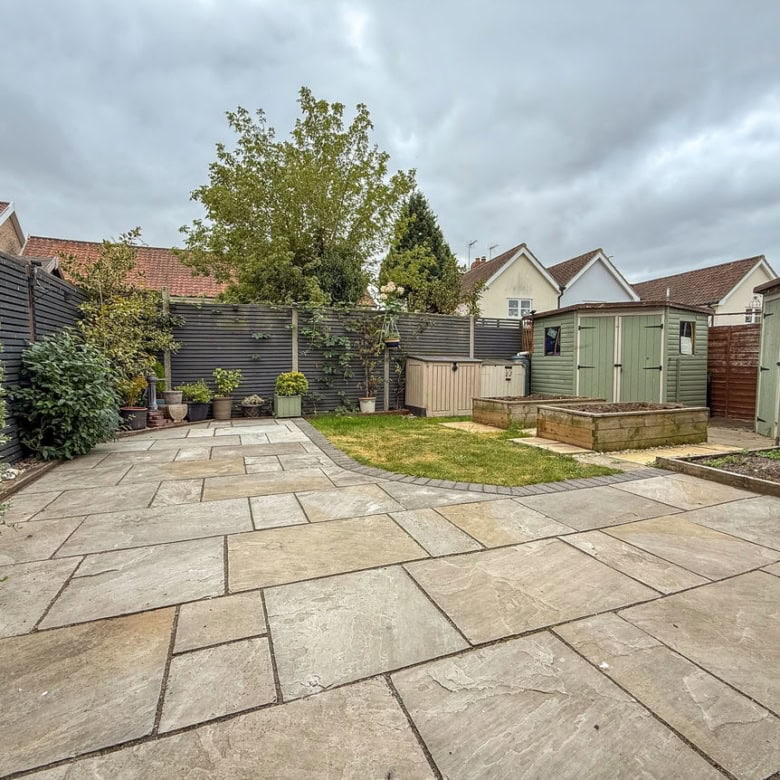 Outside, the private garden enjoys plenty of natural light throughout the day, with space for outdoor seating and play.