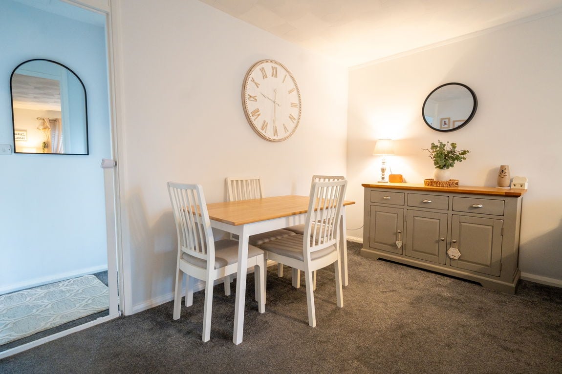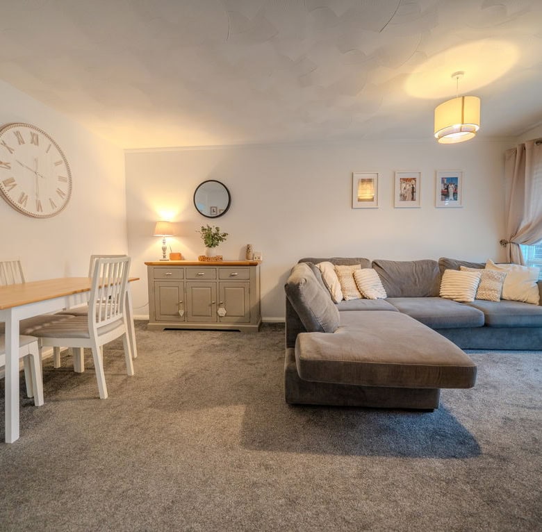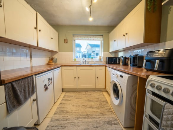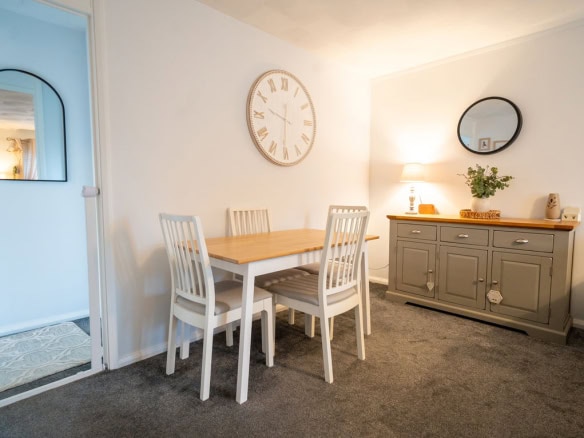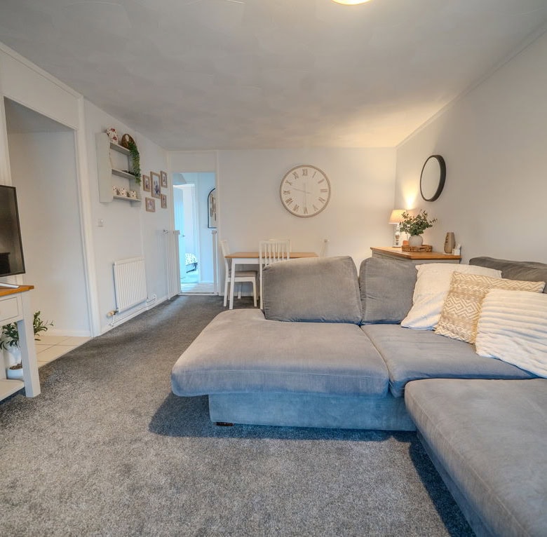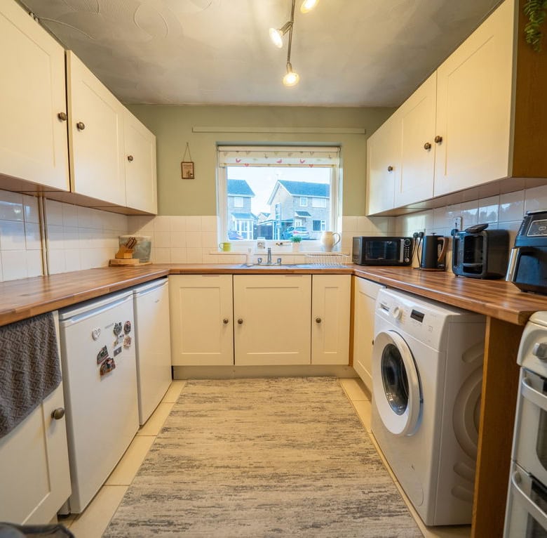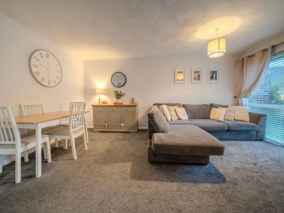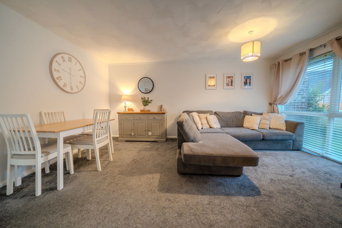 Internally, a small entrance hallway leads through to the kitchen, which offers plenty of worktop space and storage and provides a practical layout for everyday living. From here, the accommodation opens into a spacious living and dining area that is filled with natural light, creating a bright and airy space to relax or entertain.