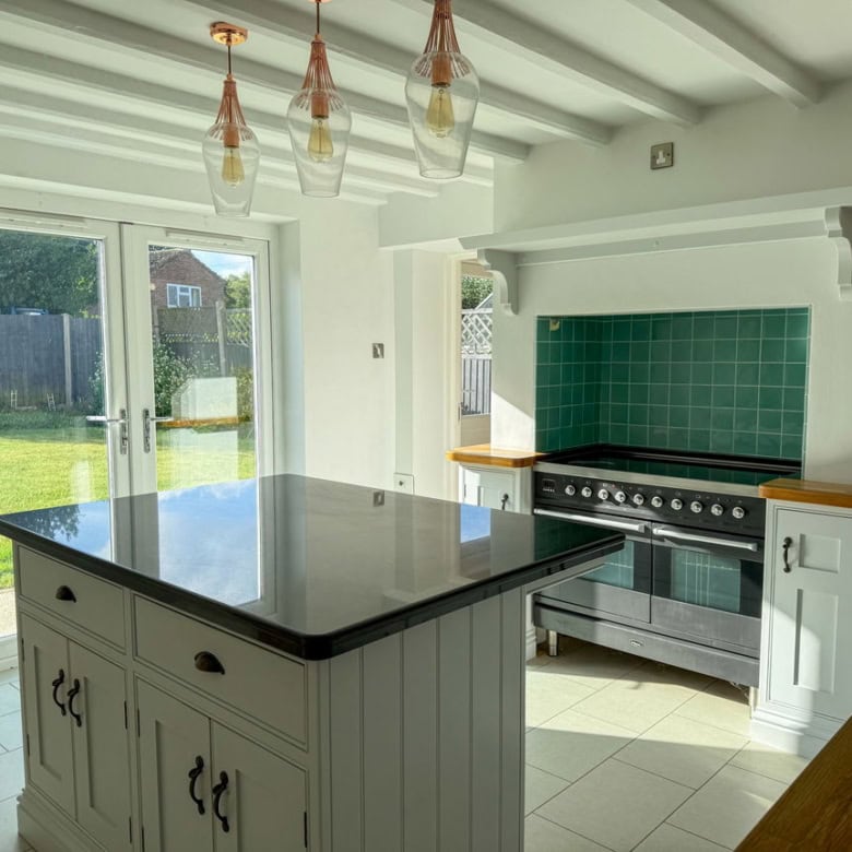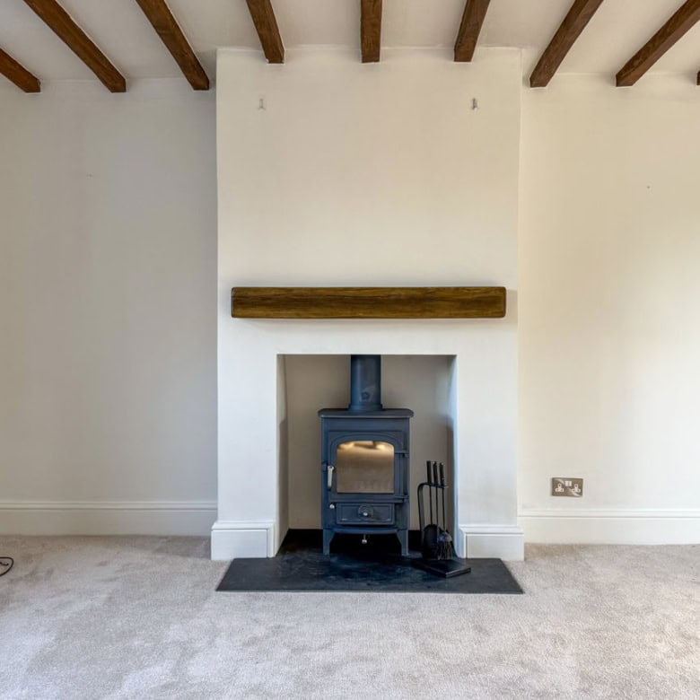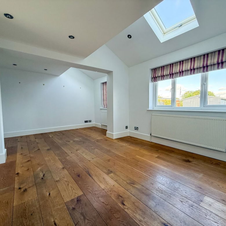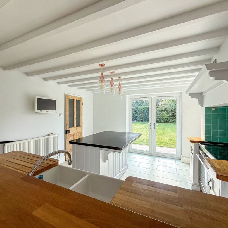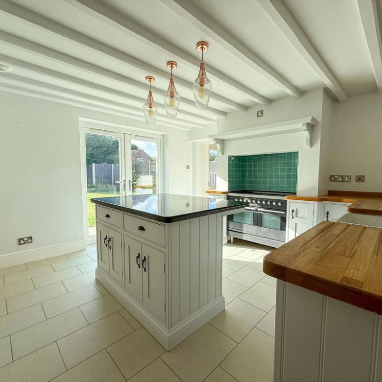 The ground floor offers a bright and welcoming living room, featuring a wood burner and French doors that open onto the garden. To the rear, a modern kitchen with a central island also enjoys direct access to the south-facing garden, making it perfect for entertaining. A separate dining room enhanced by Velux windows creates a light-filled space for family meals. Completing the ground floor are a useful utility room and a convenient downstairs WC.